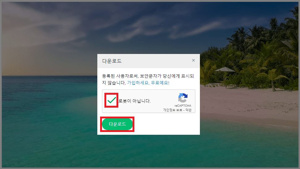 다운로드 창이 보이면 '로봇이 아닙니다' 박스에 체크하고 아래 다운로드를 클릭해 주세요.