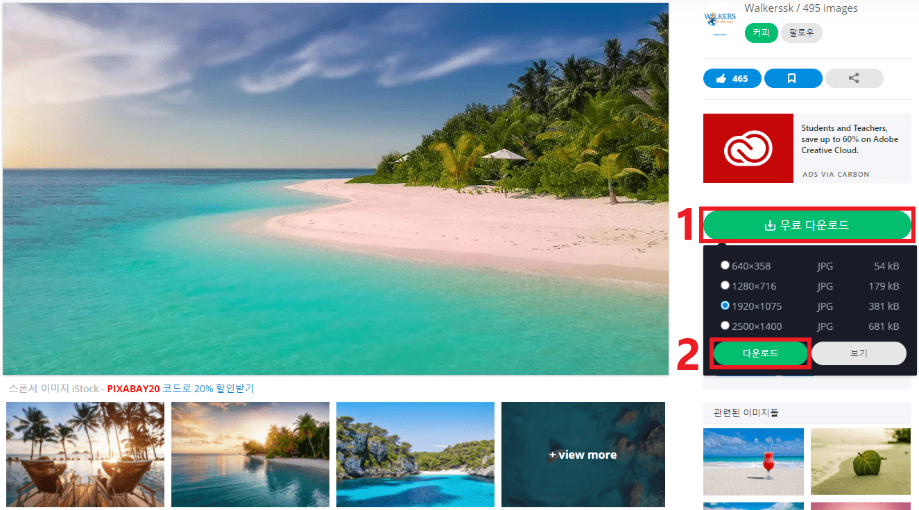 사용하고자 하는 이미지를 선택하였다면 우측에 있는 무료 다운로드 클릭 → 사진의 크기와 용량설정 → 다운로드 클릭해 주세요. 맨 아래 보이는 스폰서 이미지는 해상도가 높은 사진으로 유료 결제가 필요합니다. 현재 다운로드하는 사진도 충분히 사용하기에 퀄리티가 있는 사진으로 무료 이미지를 사용하는게 좋습니다.