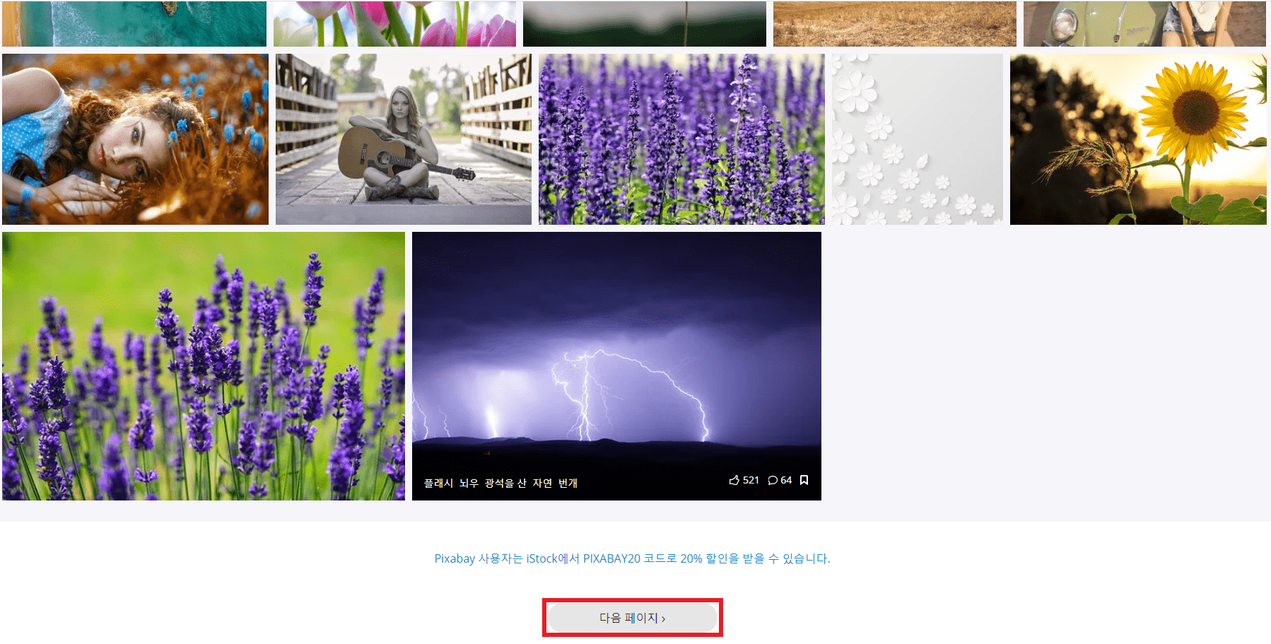 검색 후 183,543개의 여름 무료 이미지가 확인이 됩니다. 마우스 스크롤을 아래로 내려 여름에 관한 수많은 이미지를 찾아볼 수 있으며, 맨 아래 '다음 페이지'를 클릭해 다음 페이지로 이동합니다. 그리고 검색 시 한글보다는 영어로 검색하면 찾고자 하는 결과물을 더 많이 얻을 수 있으니 참고해 주세요.