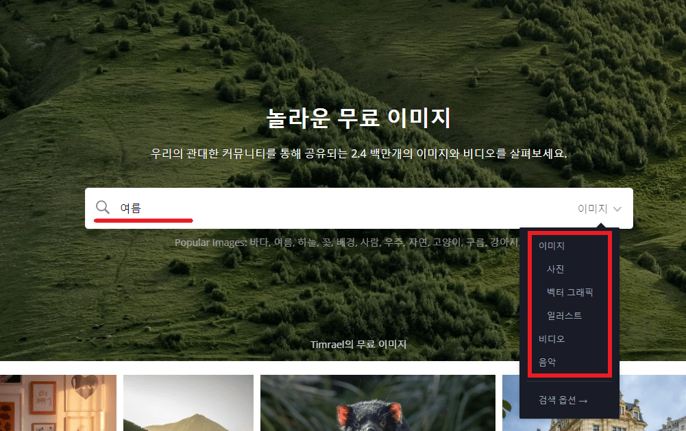 이제 검색하고자 하는 이미지, 사진, 백터 그래픽, 일러스트, 비디오, 음악 등 메뉴에서 콘텐츠를 선택하고 입력 후 검색 해주세요. 저는 이미지를 선택하고 '여름'을 검색해 보도록 하겠습니다.