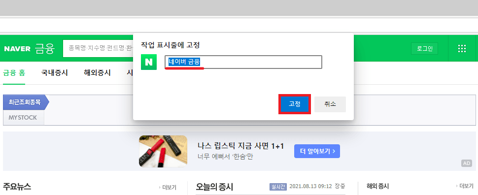 바탕화면 하단 작업 표시줄에 네이버 증권이 고정 됩니다.