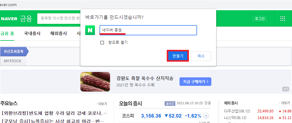 바로가기를 만드시겠습니까? 창에서 네이버 증권을 입력하고 아래 만들기를 클릭해 주세요.