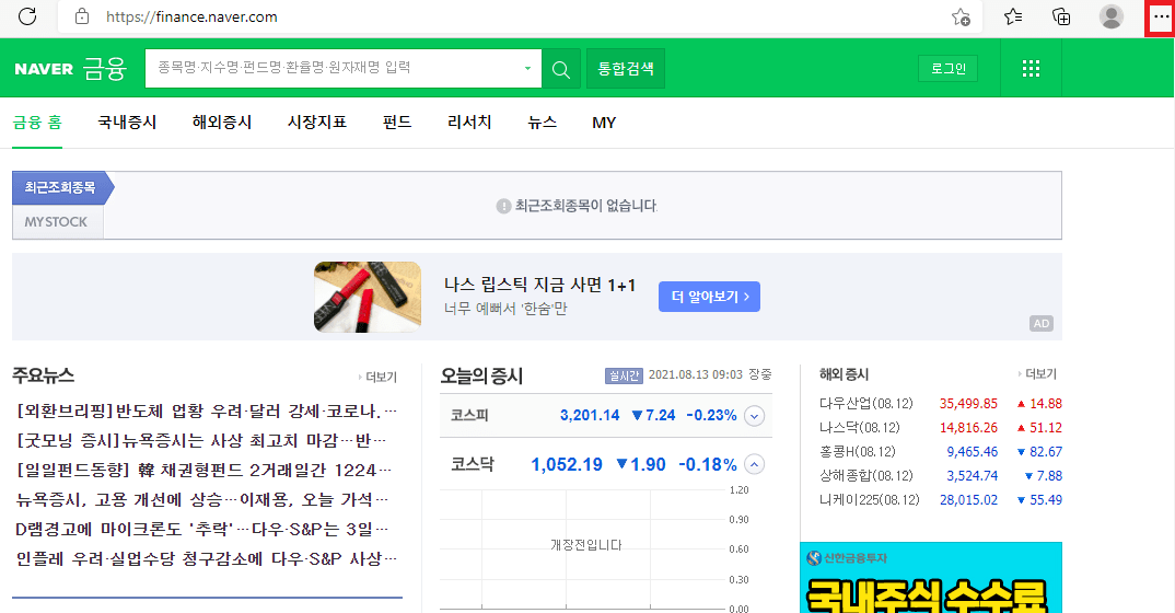 2. 첫 번째 방법과 동일하게 바탕화면에 설치된 엣지(edge)에 접속 후 검색창에 '네이버 증권 입력'하고 아래 '네이버 금융'을 클릭해 주세요. 그리고 네이버 증권 메인화면에서 우측 상단에 보이는 점 3개 아이콘을 클릭합니다.