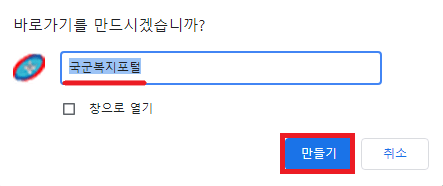바로가기를 만드시겠습니까? 창이 뜨면 입력란에 제목을 입력하고 아래 만들기를 클릭해 주세요.