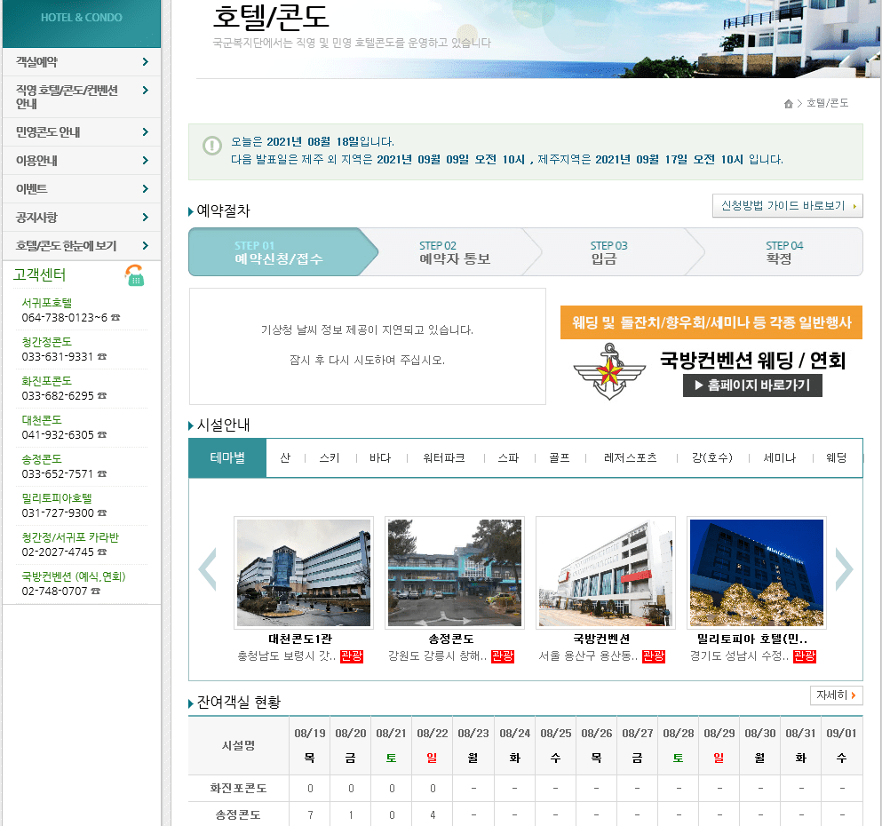 국군복지단에서는 직영 및 민영 호텔, 콘도 등을 운영해 이용하고자 하는 시설의 지역을 일자별로 객실을 조회하여 바로 예약 가능하며 화면에서 잔여 객실 현황도 확인할 수 있습니다.