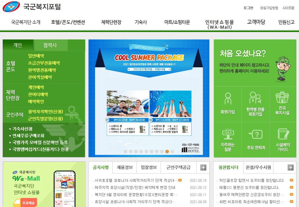 국군복지단에서는 각종 정보를 손쉽게 찾아볼 수 있어 호텔 및 콘도, 체력단련장 등 복지시설 예약과 주요 복지시설 정보, 개인별 이용내역 및 면세 주류 구매 내역 조회 등 다양한 기능의 서비스를 누구나 쉽게 이용할 수 있는데요. 국군복지단 홈페이지에 접속하여 제공되는 서비스 기능이 어떠한 것들이 있는지 간단히 알아보고 오늘 포스팅할 홈페이지 바로가기 설정 방법에 대해서도 알려드리겠습니다.
