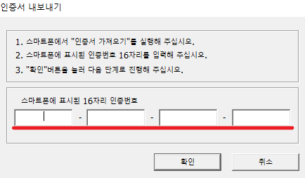 이제 농협인터넷뱅킹을 통해 PC에서 내보내기한 인증서를 가져오기 위해 아래 인증번호 16자리가 생성이 되었습니다. 이제 스마트폰 생성된 인증번호를 농협인터넷뱅킹 공인인증센터에서 내보내기한 팝업창 입력란에 16자리 인증번호를 입력하면 됩니다.