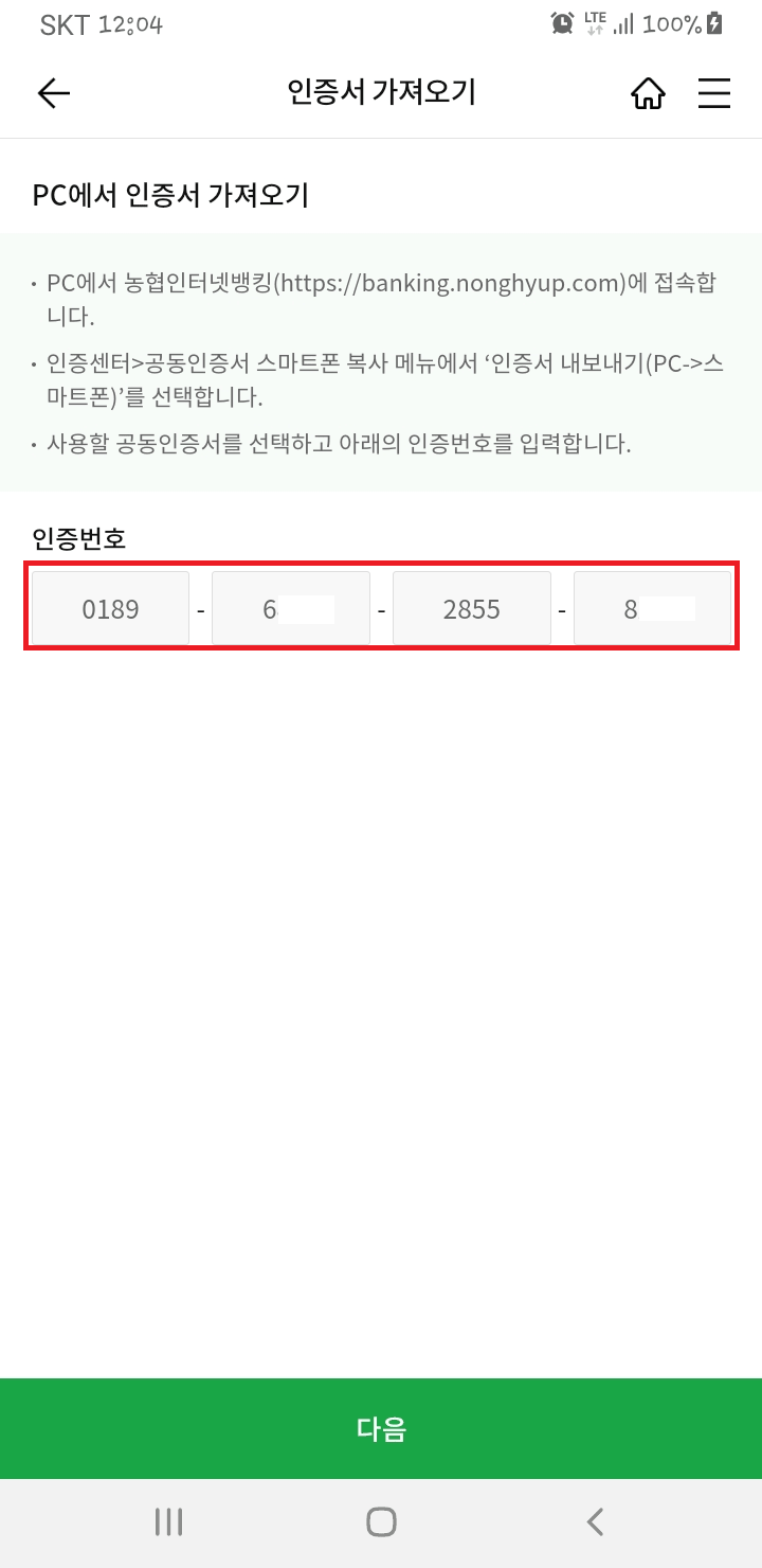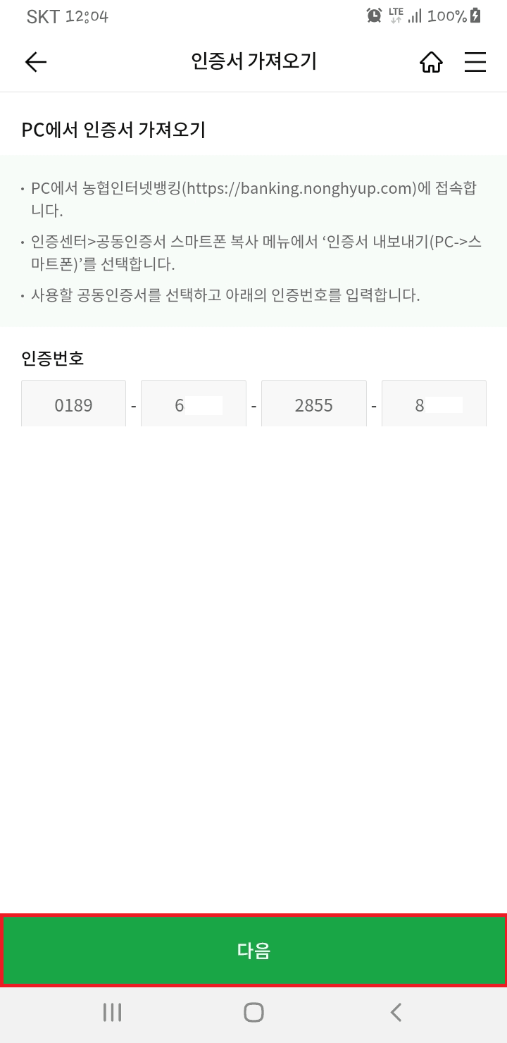 마지막으로 PC를 통해 농협인터넷뱅킹에서 내보내기한 공인인증서(공동인증서)를 가져오기 아래 '다음'을 클릭해 주세요.