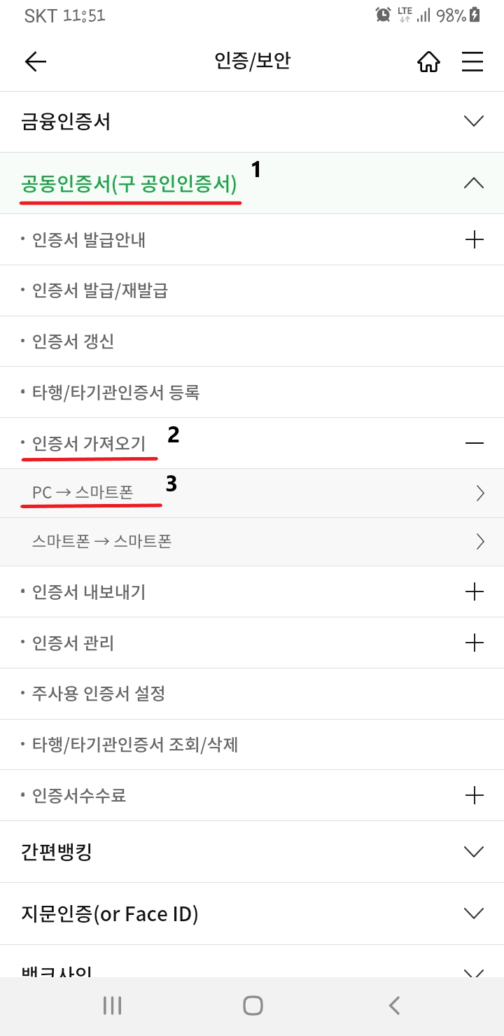 인증/보안 설정에서 '공인인증서(공동인증서)' 클릭 → '인증서 가져오기' 클릭 → 'PC에서 → 스마트폰'을 클릭해 주세요.
