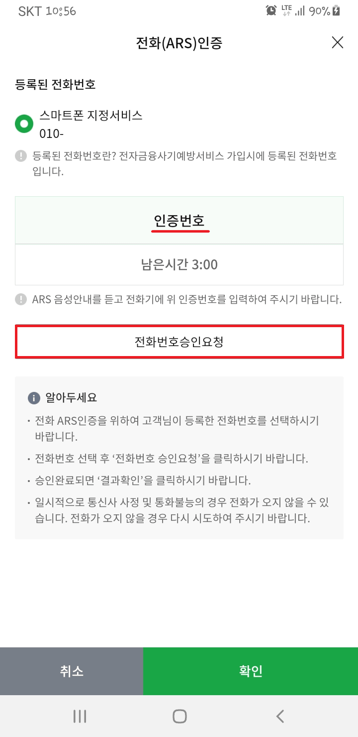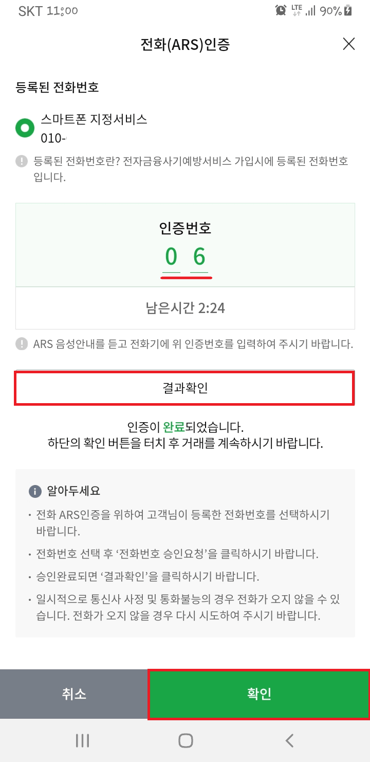 전화(ARS)인증 화면으로 '전화번호 승인요청'을 클릭해 ARS 전화가 오면 '인증번호'를 입력하고 승인완료 되면 '결과확인'을 클릭 아래 '확인'을 클릭 합니다.