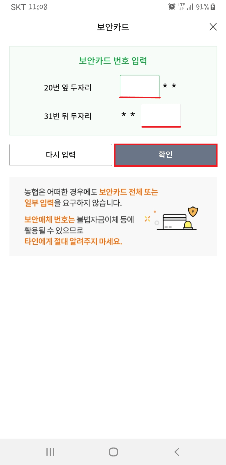 보안카드 번호 앞, 뒤 두자리 입력 후 '확인'을 클릭해 주세요.