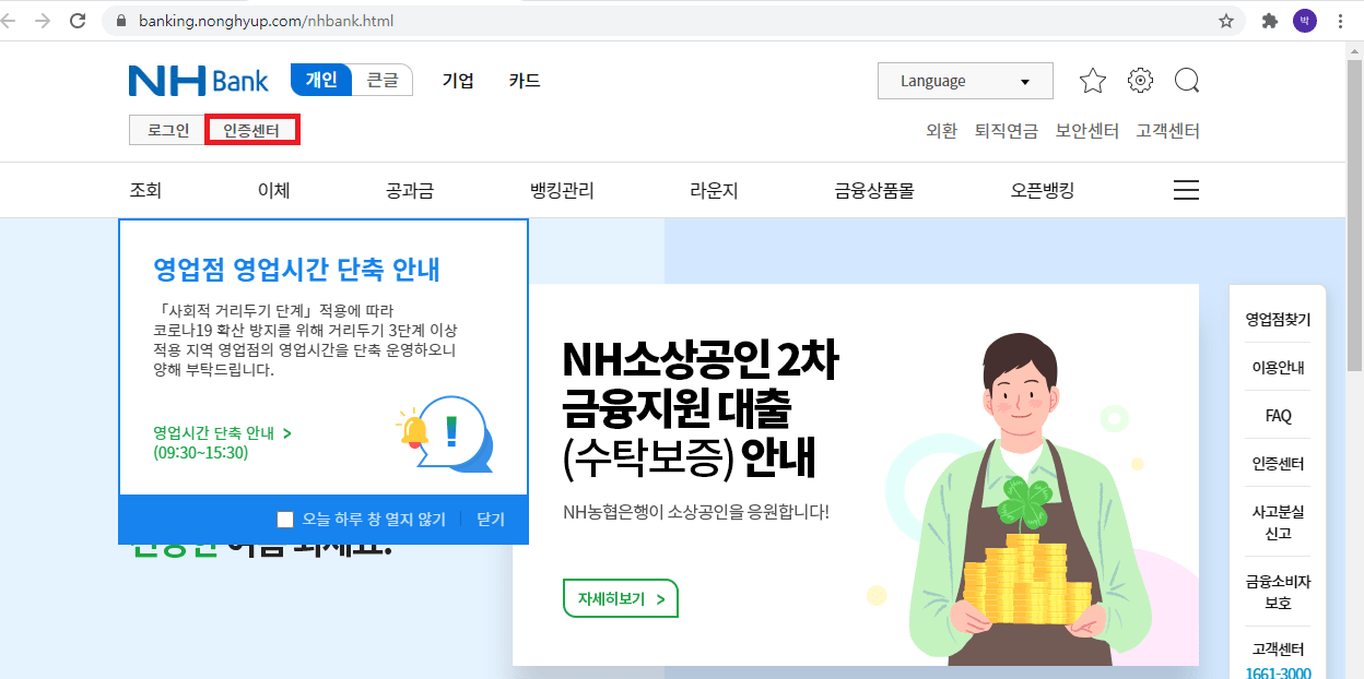 농협인터넷뱅킹 홈페이지 메인 화면 입니다. 공인인증서 내보내기로 이동하기위해 좌측상단에 '인증센터'를 클릭해 주세요.