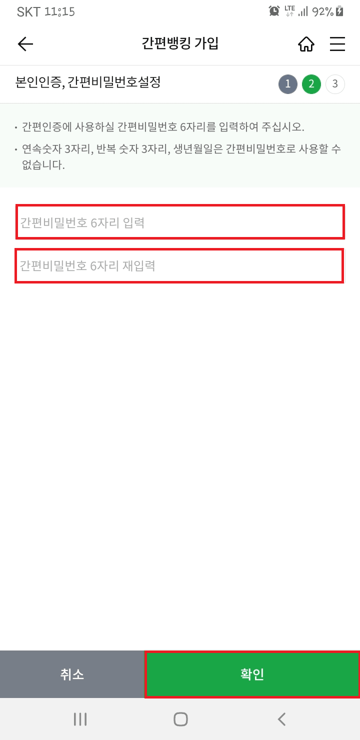 간편인증에 사용할 간편비밀번호 6자리를 입력하고 '확인'을 클릭해 주세요. 연속숫자 3자리, 반복숫자 3자리, 생년월일은 간편비밀번호로 사용할 수 없으니 참고해 주세요.