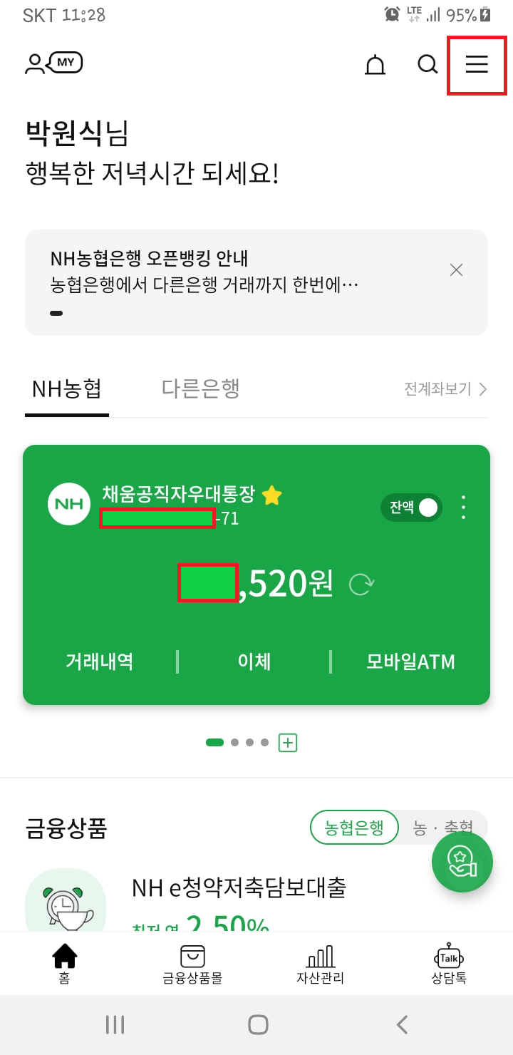간편뱅킹 서비스 가입 완료 후 NH스마트뱅킹 메인 화면 입니다. 이제 농협인터넷뱅킹에서 내보내기한 공인인증서(공동인증서)를 가져오기 위해 우측 상단에 막대3개 아이콘을 클릭해 주세요.