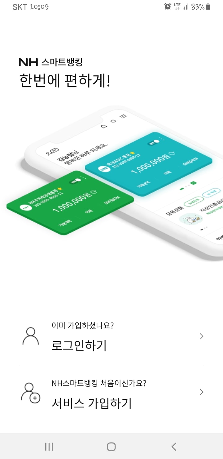 'NH스마트뱅킹' 메인 화면입니다. 재설치 후 아래 '이미가입하셨나요? 로그인하기' 와 'NH스마트뱅킹 처음이신가요? 서비스 가입하기' 보이는데요. 그전부터 사용했던 NH스마트뱅킹 어플이라 '로그인하기'를 클릭해 주세요. 처음 사용하신다면 아래 서비스 가입하기를 클릭하고 진행해 주시면 됩니다.