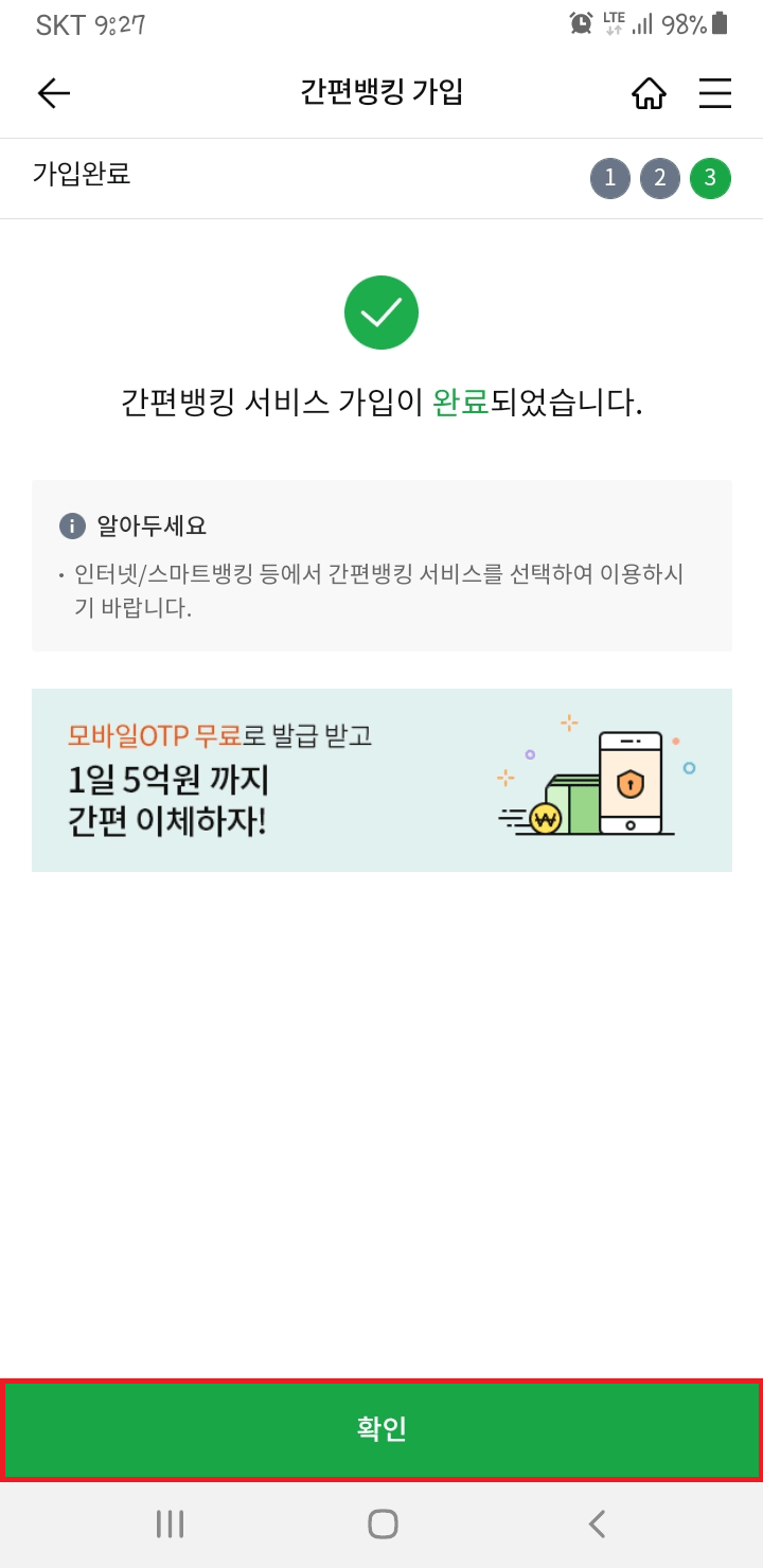 간편뱅킹 서비스 가입이 완료 됩니다. '확인'을 클릭해 주세요.