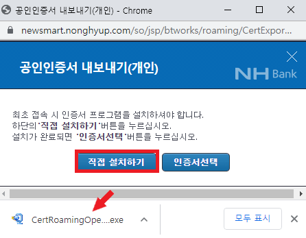 공인인증서 내보내기(개인) 팝업창으로 처음 접속한다면 인증서 프로그램을 설치하고 진행해야 합니다. 아래 '직접설치'하기를 클릭해 주세요.