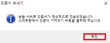 농협 서버로 인증서보내기가 정상적으로 전송 되었습니다. '확인'을 클릭해 주세요.