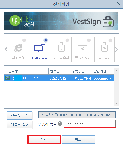 공동 인증서 로그인을 위해 저장매체를 선택하고 인증서 암호 입력 후 확인을 클릭해 주세요.