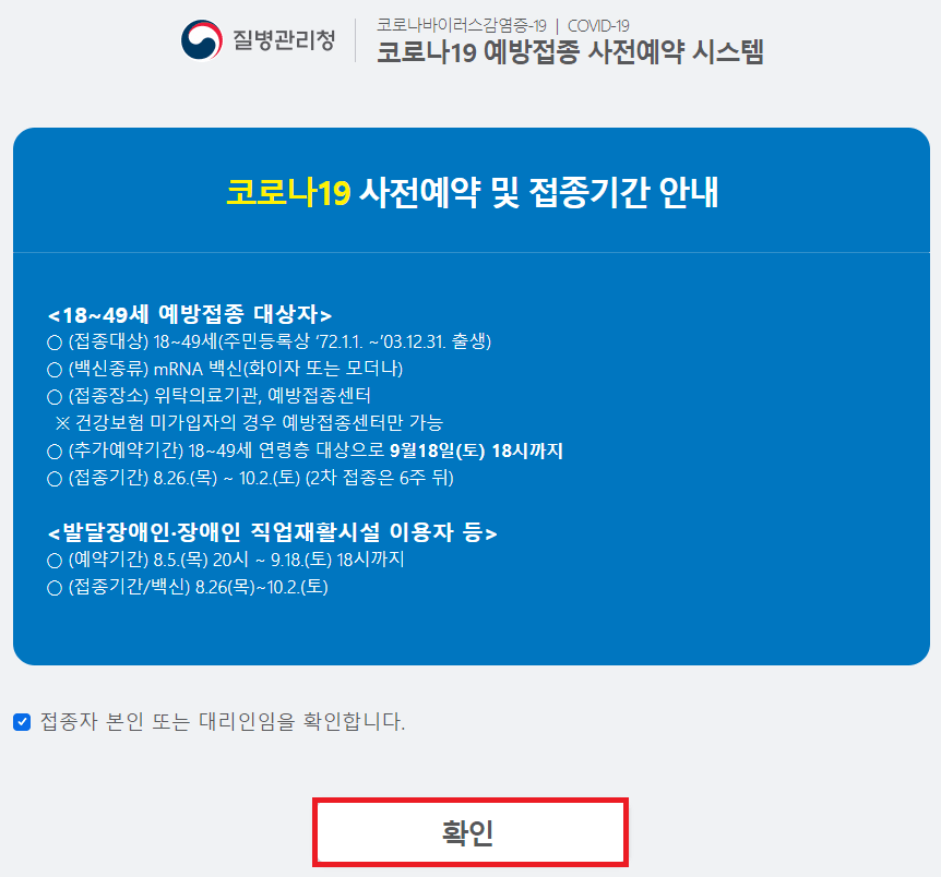 접속 후 '코로나19 예방접종 사전예약 시스템' 홈페이지에 접속 화면으로 위에 알려 드린 내용과 동일하며 내용 확인하였다면 아래 '접종자 본인 또는 대리인임을 확인합니다'에 체크를 하고 확인을 클릭해 주세요.