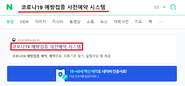 첫 번째로 자주 사용하시는 포털 검색창에 '코로나19 예방접종 사전예약 시스템'을 입력하고 검색하여 주세요. 검색 후 '코로나19 예방접종 사전예약 시스템' 홈페이지에 접속해 주세요.