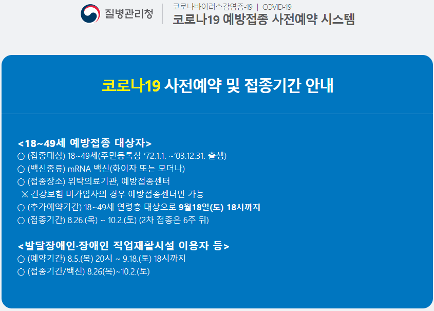 백신 접종 예약이 지난 8월 21일(토) 20시부터 ~ 9월 18일(토) 18시까지 18세부터 ~ 49세까지(1972~2003년생) '코로나19 예방접종 사전예약 시스템'으로 추가 예약을 할 수 있습니다.
