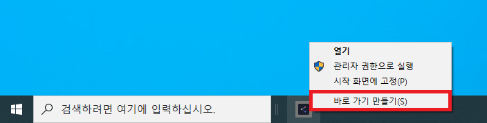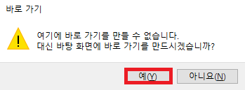 클릭 후 '바로가기' 팝업창이 뜨고 '여기에 바로 가기를 만들 수 없습니다. 대신 바탕화면에 바로 가기를 만드시겠습니까?' 질문에 예(Y)를 클릭해 주세요.
