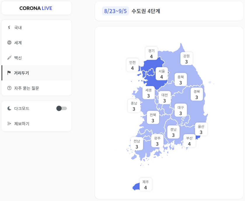 코로나 거리두기 단계별 기준 및 방역수칙 준수 사항입니다. 현재 8월 23일부터 ~ 9월 5일까지 수도권은 4단계 유지되며, 시ㆍ도별 거리두기 단계를 한번에 확인할 수 있습니다.