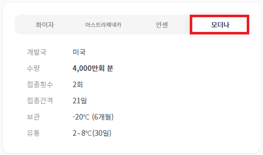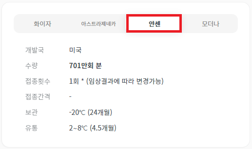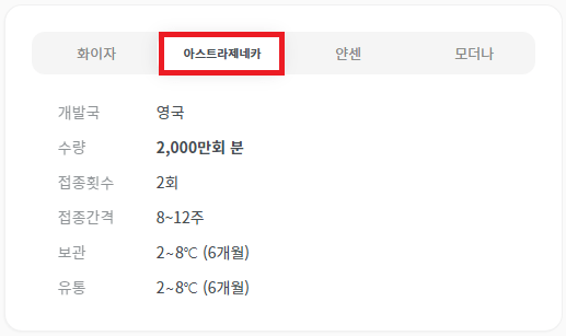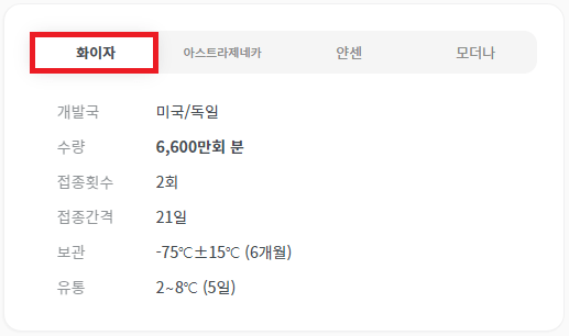 그리고 대한민국 국민이 접종해야 할 백신이 종류별로 구분되어 있어 개발국, 수량, 접종 횟수, 접종 간격 등의 내용을 자세하게 확인할 수 있습니다.