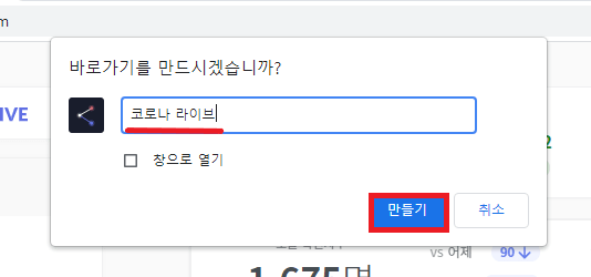 만들기 클릭 후 바탕화면에 '코로나 라이브' 바로가기 아이콘이 생성됩니다.