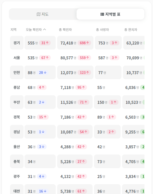 지도를 클릭하면 전국 코로나 확진자수가 한눈에 보이고, 지역별 표는 오늘 확진자, 총 완치자 등 확진자 수를 좀 더 자세하게 확인할 수 있습니다.