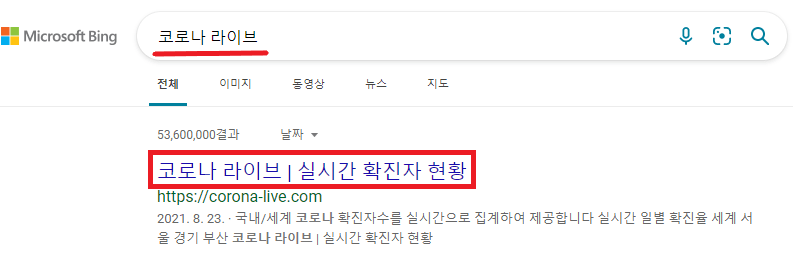 현재 사용하고 있는 엣지 브라우저에 접속하여 검색창에 '코로나 라이브'를 입력 하고 '코로나 라이브' 홈페이지로 이동해 주세요.