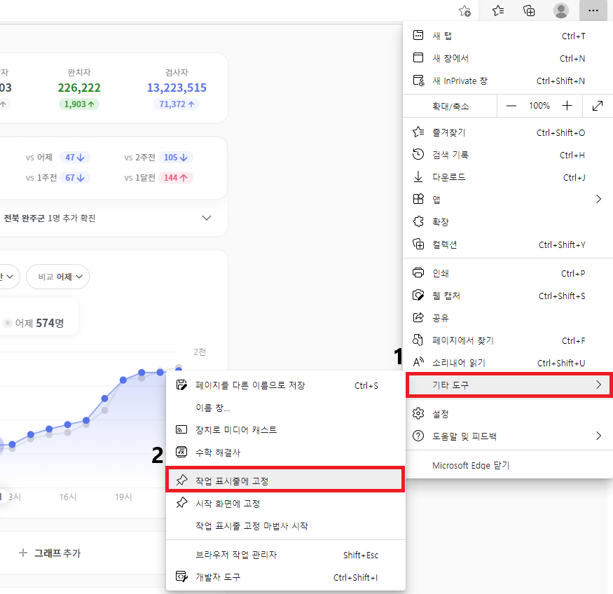 다음으로 기타 도구 → 작업표시줄에 고정을 클릭해 주세요.