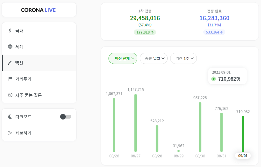 대한민국 코로나 백신 접종 현황으로 현재까지 1차 접종은 29,458,016명이 백신을 접종하였고, 접종 완료(2차 접종) 인원은 16,283,360명이 완료하였습니다.