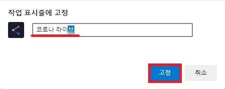 '작업 표시줄에 고정' 팝업창에 바로가기 아이콘 제목을 입력하고 고정을 클릭해 주세요.