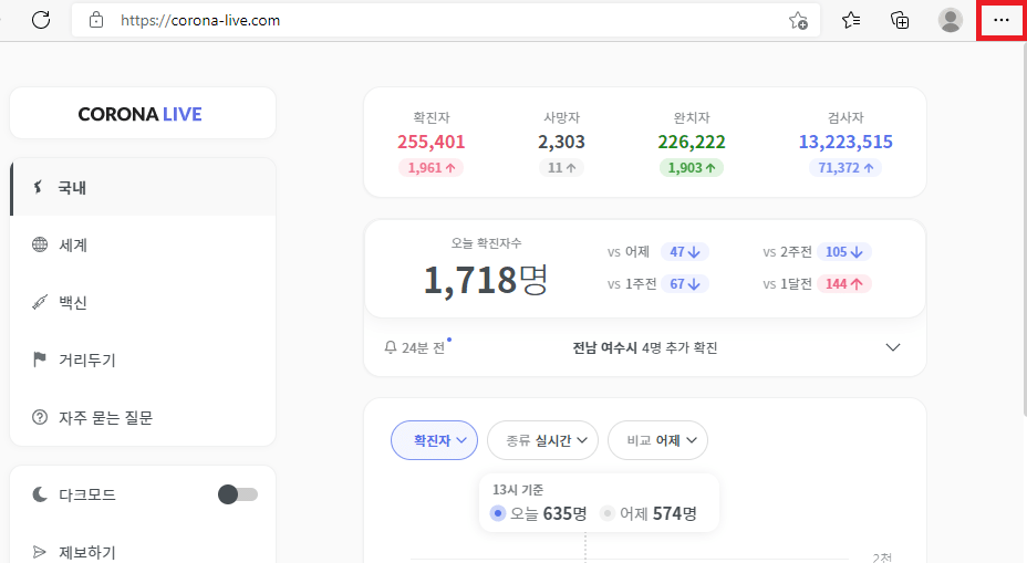 코로나 라이브 홈페이지 화면입니다. 바로가기 설정을 위해 우측 상단에 점 3개 아이콘을 클릭해 주세요.