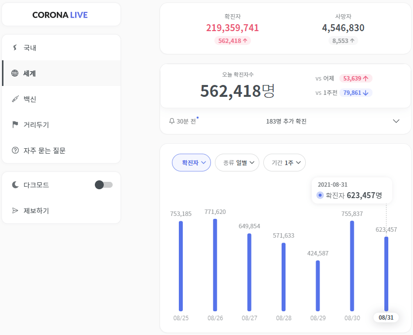 코로나 세계 확진자 현황입니다. 현재 확진자 수 562,418명으로 어제 및 1주 전으로 증가 및 감소를 쉽게 확인할 수 있고, 세계 실시간 확진 현황으로 나라별 추가 확진 인원수를 알 수 있습니다.