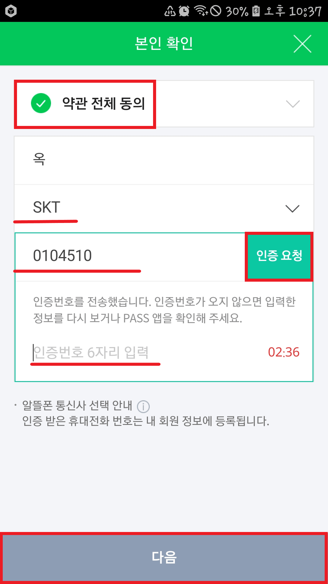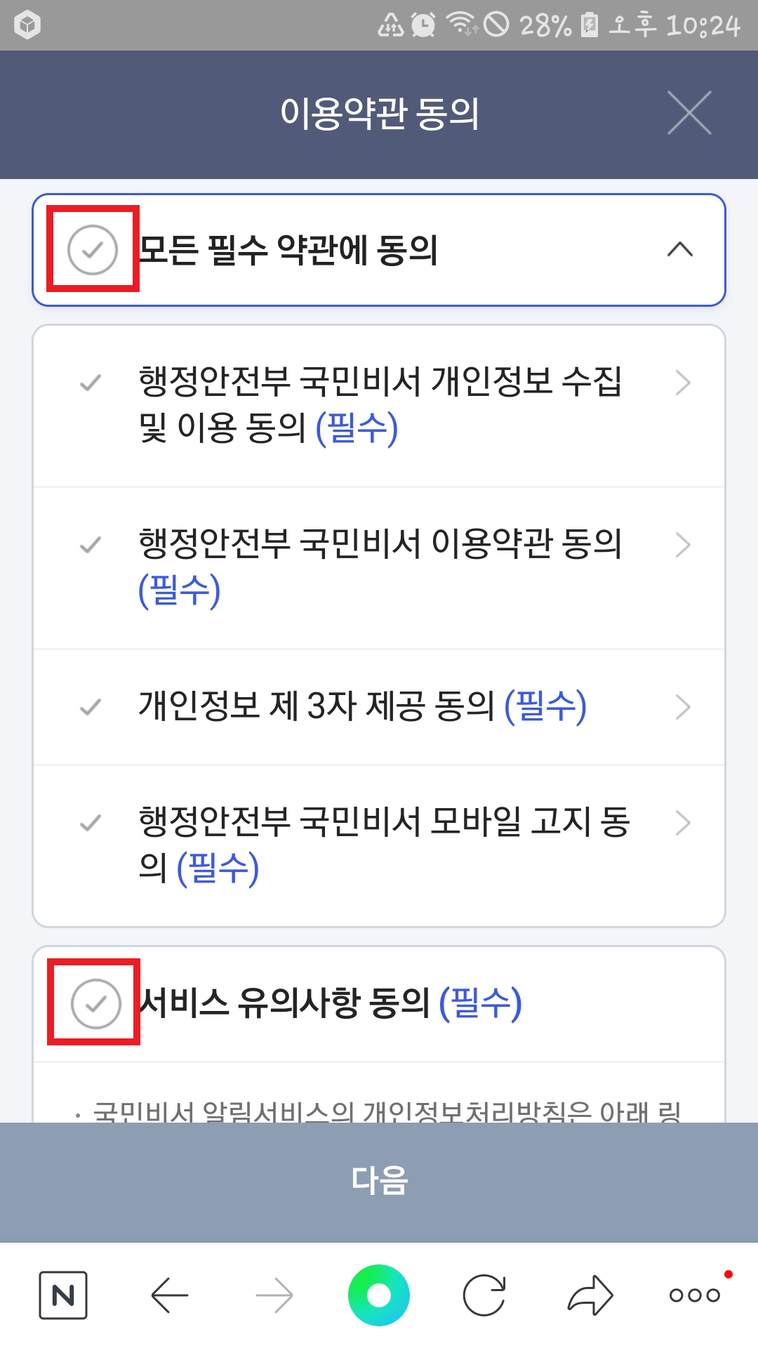 다음 이용약관 동의 화면에서 '모든 필수 약관에 동의'에 체크 후 아래 다음을 눌러 주세요.