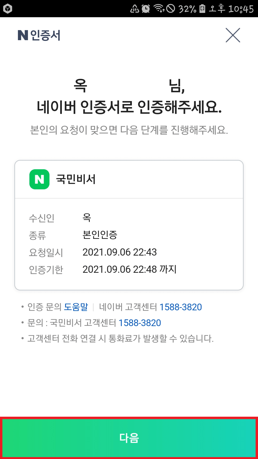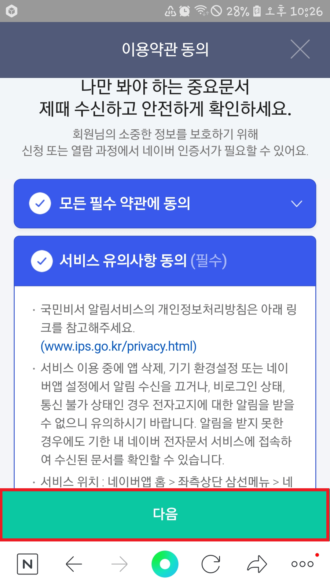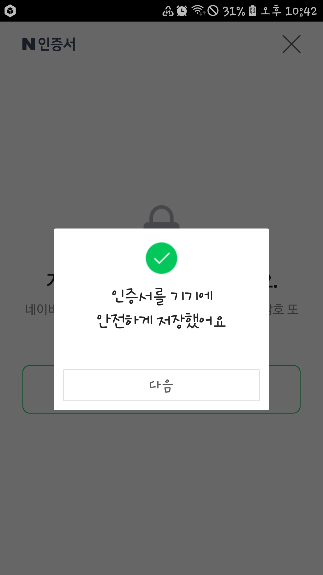 인증서가 기기에 안전하게 저장되며, 이제 네이버 인증서 본인 인증을 할 수 있습니다. 다음을 눌러 주세요.