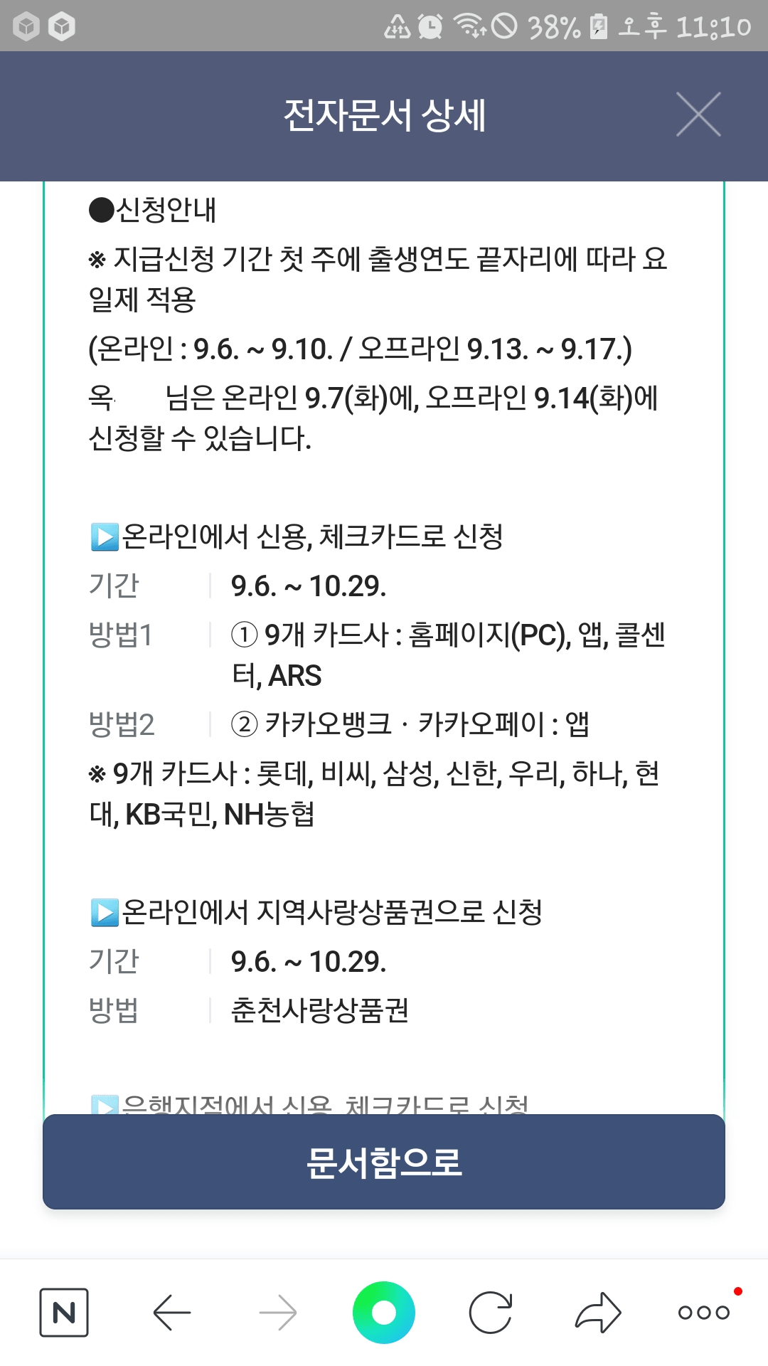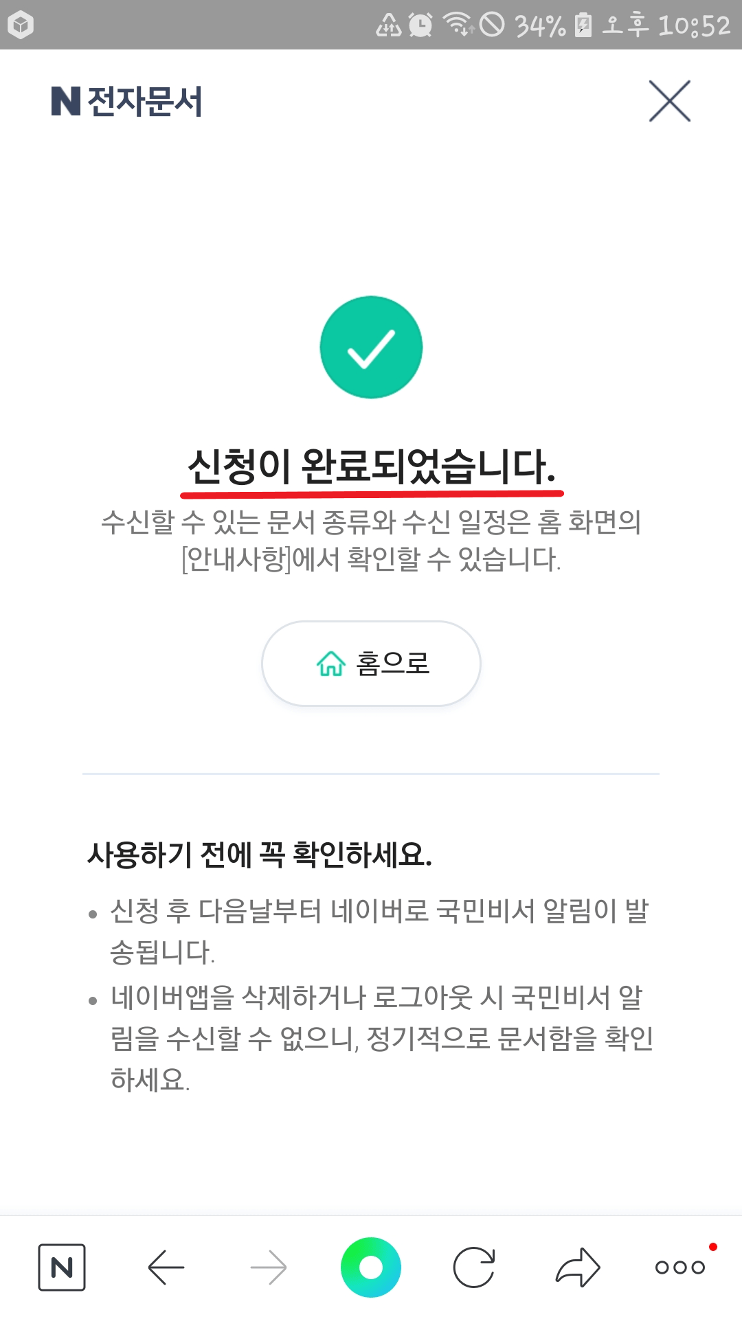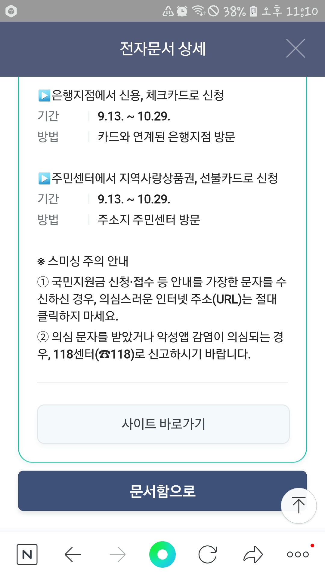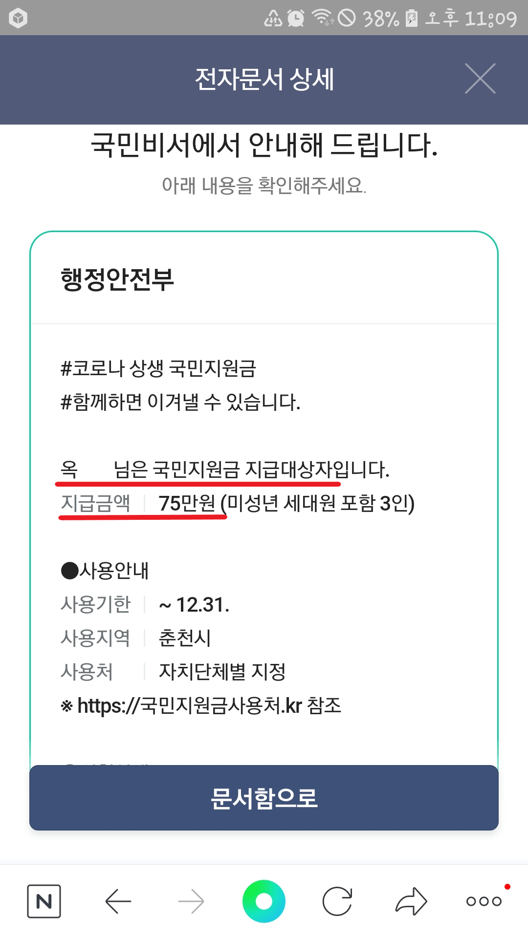 5분 경과 후 네이버 앱으로 메시지가 도착되며, 네이버 전자문서 상세화면에서 국민 지원금 지급대상자 확인을 할 수 있습니다.