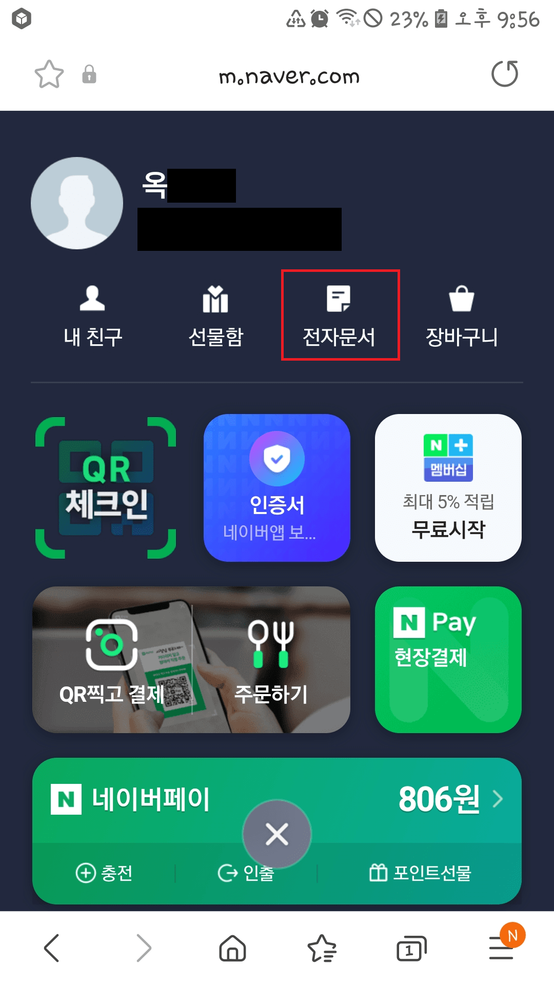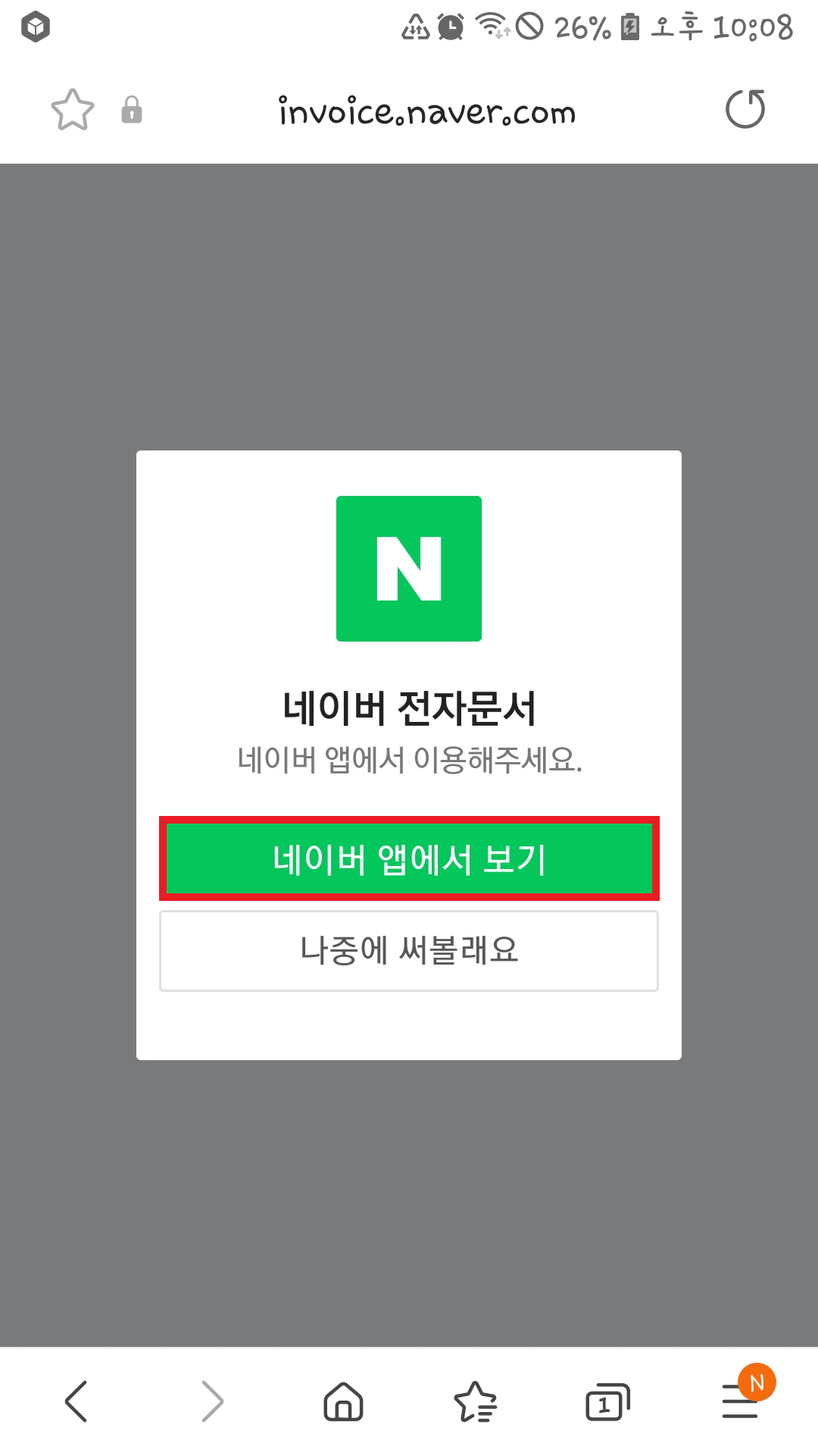 네이버 전자문서를 이용하려면 네이버 앱을 플레이스토어나 앱스토어에서 설치를 해야 합니다. 설치가 되어 있지 않다면 '네이버 앱에서 보기'를 눌러 주세요.