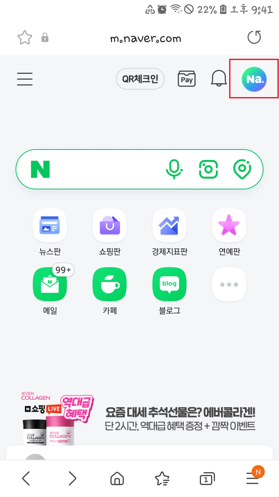 첫 번째로 스마트폰에서 네이버에 접속하고 메인 화면 우측 상단에 Na를 눌러 주세요.