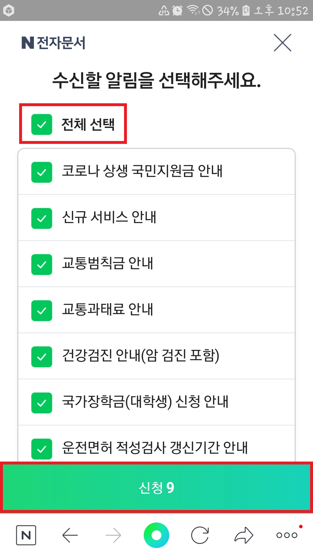 이제 수신할 알림을 선택 화면에서 전체 선택을 하고, 아래 신청을 눌러 주세요.