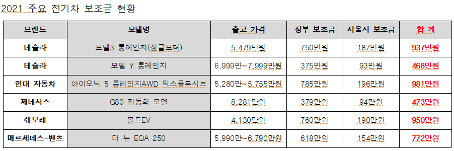 환경부 저공해차 통합 누리집에 따르면 테슬라의 전 차종은 1,000만 원 미만의 보조금을 지원받을 수 있습니다. 테슬라 모델 3 롱 레인지는 937만원(정부보조금750만원, 서울시 보조금 187만원)으러 지원이 되며, 모델 Y 롱레인지는 468만 원(정부 보조금 375만 원, 서울시 보조금 93만 원)으로 보조금 혜택이 지원됩니다.