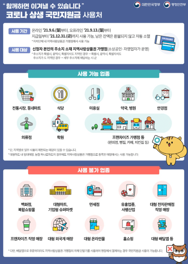 사용처는 전통시장, 동네 슈퍼마켓, 식당, 미용실, 약국, 병원, 안경점, 의류점, 학원 , 프랜차이즈 가맹점(편의점, 빵집, 카페, 치킨집 등) 등에서 사용 가능합니다. 반면 백화점, 복합쇼핑몰, 기업형 슈퍼마켓, 면세점, 유흥업종 및 사행산업, 대형 전자판매점 직영 매장, 프랜차이즈 직영 매장, 대형 외국계 매장, 대형 온라인몰, 홈쇼핑, 대형 배달 앱 등에서는 사용이 불가능합니다. (이마트, 홈플러스, 롯데마트 등 대형마트에서는 지원금을 사용을 할 수 없지만, 대형마트에 입점한 일부 임대 매장과 소상공인 점포에서는 결제가 가능합니다.)
