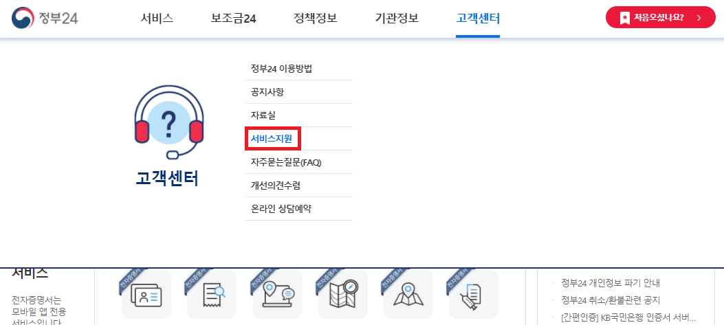 정부24 홈페이지 화면에서 우측 상단에 '고객센터'를 클릭해 주세요.