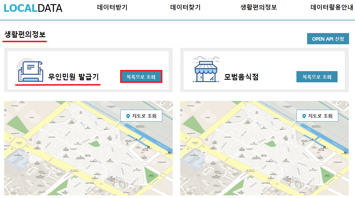 생활편의정보 → 무인민원발급기 → '목록으로 조회'를 클릭해 주세요.