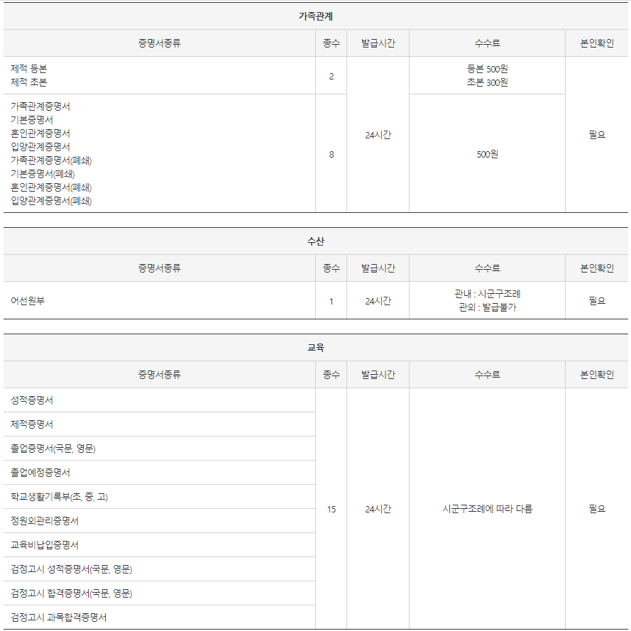 100여 종이 넘는 증명서의 종류, 발급시간, 수수료, 본인 확인 등을 확인할 수 있습니다. 무인민원발급을 받기 전 발급받고자 하는 증명서가 무인민원 발급 목록에 있는지 체크하면 좋을 것 같습니다.