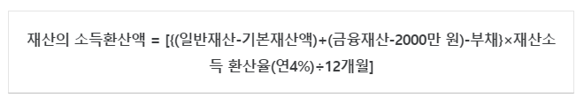 재산의 소득환산액은 본인과 배우장의 재상 총액에 재산의 소득환산율을 곱해 산출한 금액입니다.