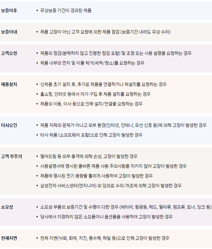 ㆍ 유상 수리는 보증 이후, 보증 이내, 고객 요청, 제품 설치, 타사 요인, 고객 부주의, 소모성 제품, 천재지변 등이 해당되니 자세한 내용은 아래를 참고해 주세요.